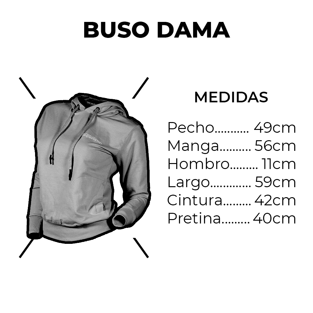 Buso para dama con capota marca SUPER OPEN talla unica, elaborado en burda licrada y rit (pretinas) cuello redondo con cordon de ajuste y estampado en plastisel, recomendaciones de lavado, no echar en remojo ni planchar, garantia de 3 meses sobre materiales y fabricacion. no aplica por decoloracion por uso de blanqueador. producto 100% colombiano.