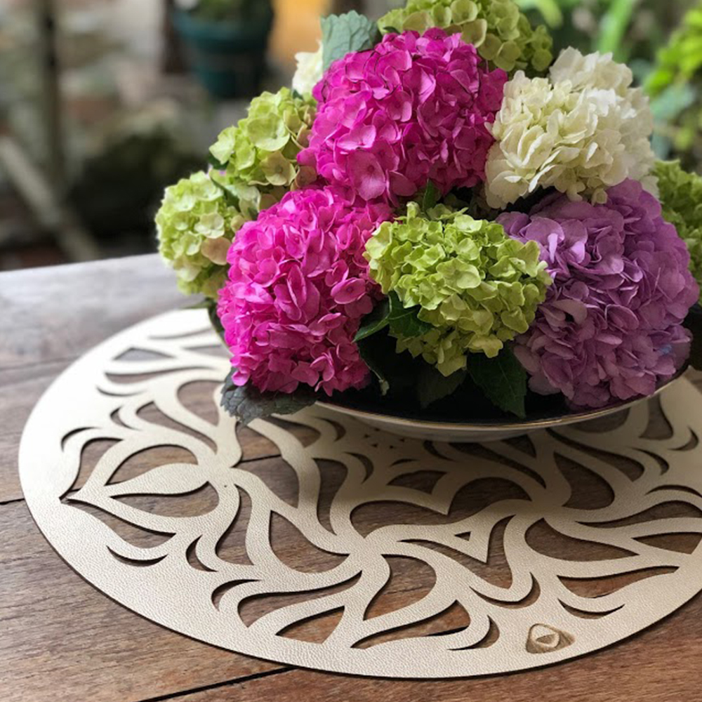 Individual para mesa doble faz fácil de limpiar con forma redonda, su modelo es llamado Circle y viene con dos colores los cuales son Plateado-Dorado / Plateado-Oro Rosa / Dorado-Oro Rosa / Azul Mate-Plateado / Dorado-Azul Mate. Cuenta con 3 tamaños diferentes como lo son:
